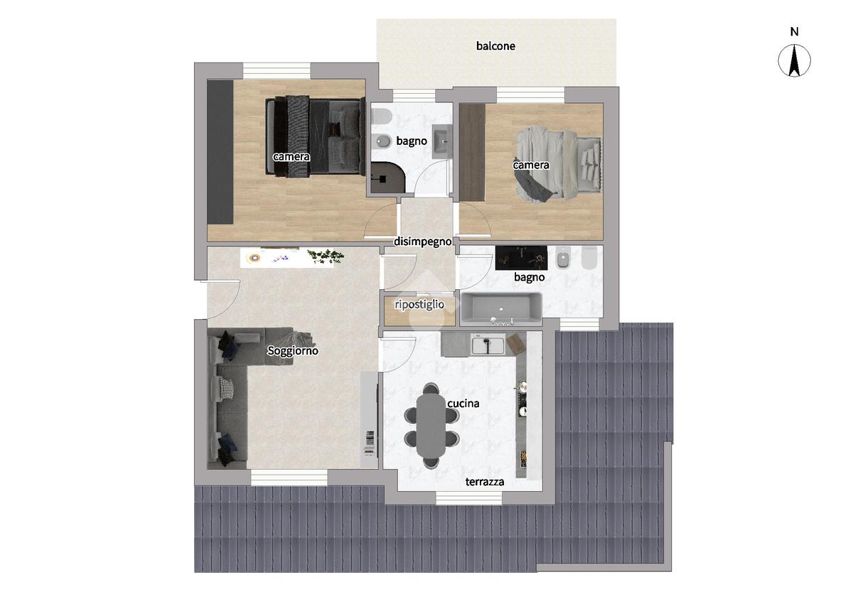 La zona notte è composta da due camere da letto di cui una con acesso diretto al balcone. L'immobile è completo di due servizi finestrati con doccia e vasca. Il pratico ripostiglio permette di avere uno spazio in più per l'archiviazione.