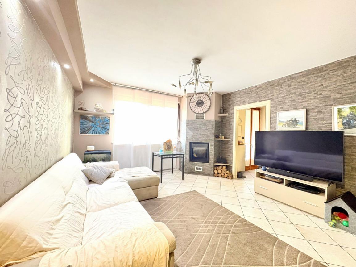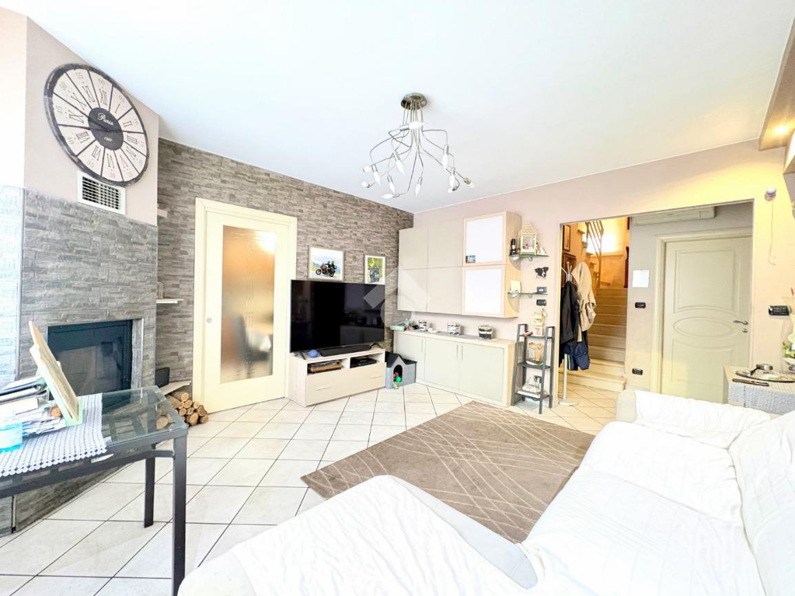 Il portoncino si apre su l'ingresso che conduce a un'ampia e luminosa zona giorno, caratterizzata da un grande soggiorno con camino, ideale per momenti di relax e convivialità.
