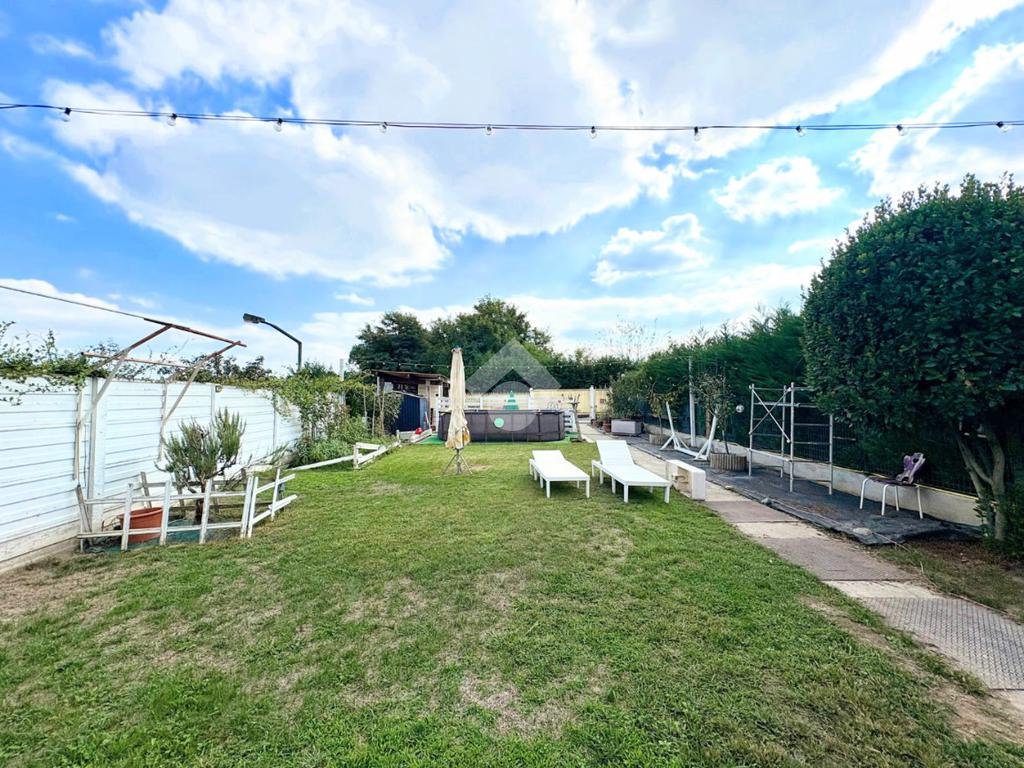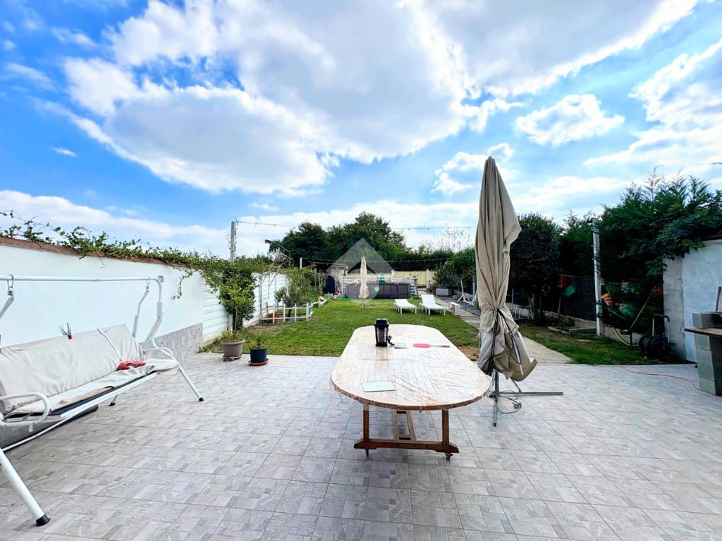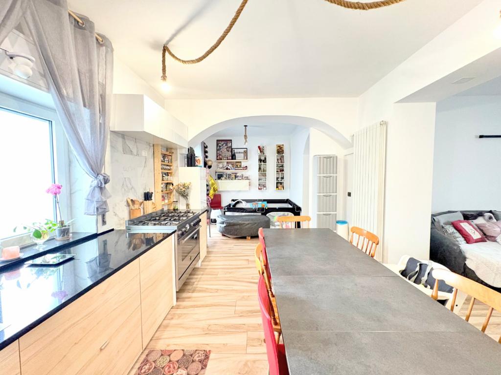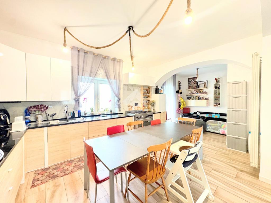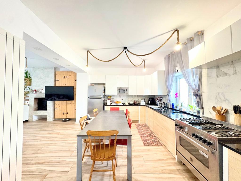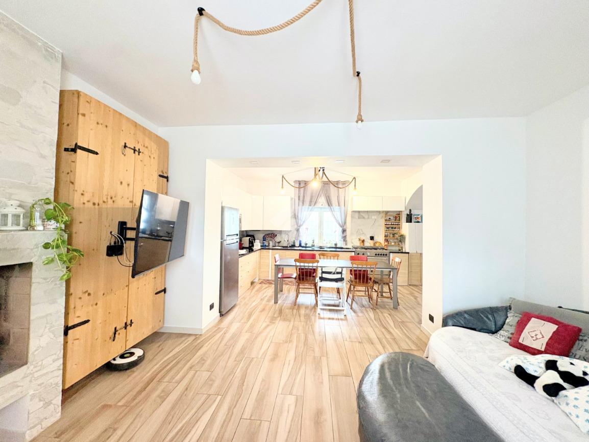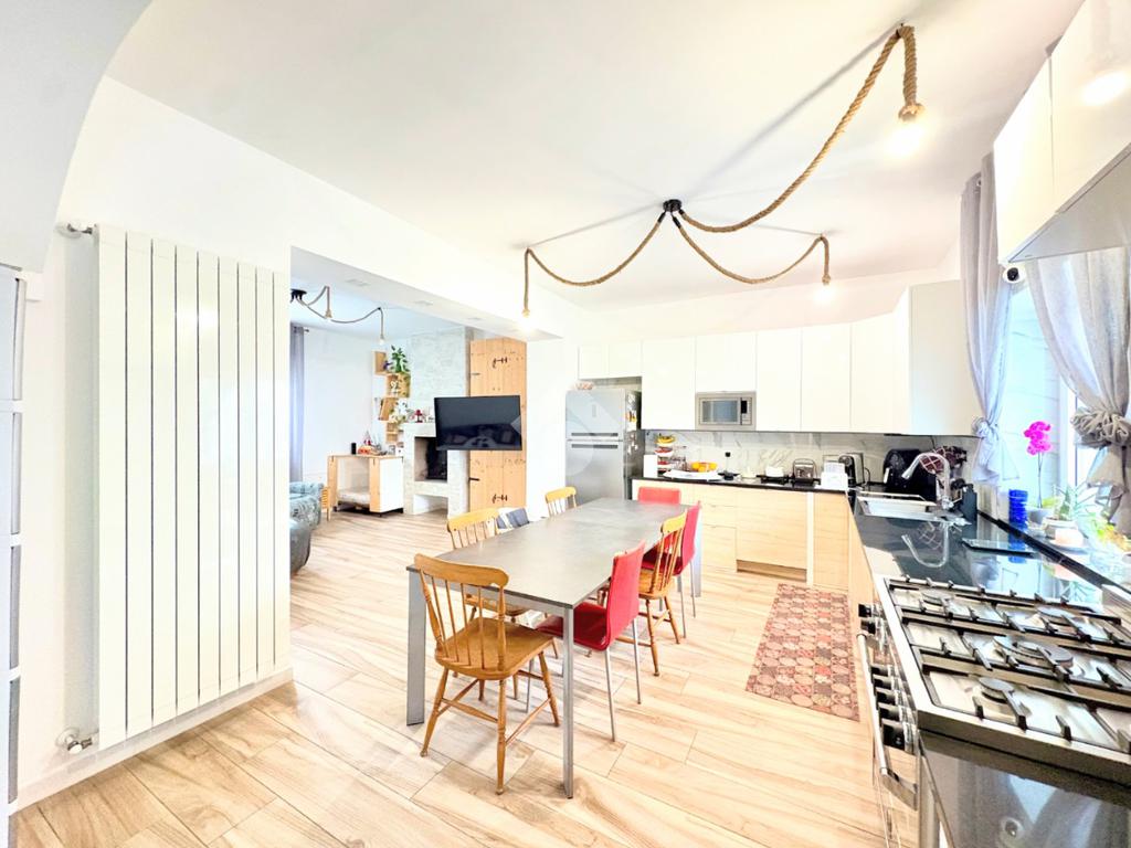 Al piano terra il portoncino blindato si apre sulla grande e luminosa zona giorno con cucina a vista e accesso diretto al giardino privato, ideale per pranzi all'aperto o momenti di relax.