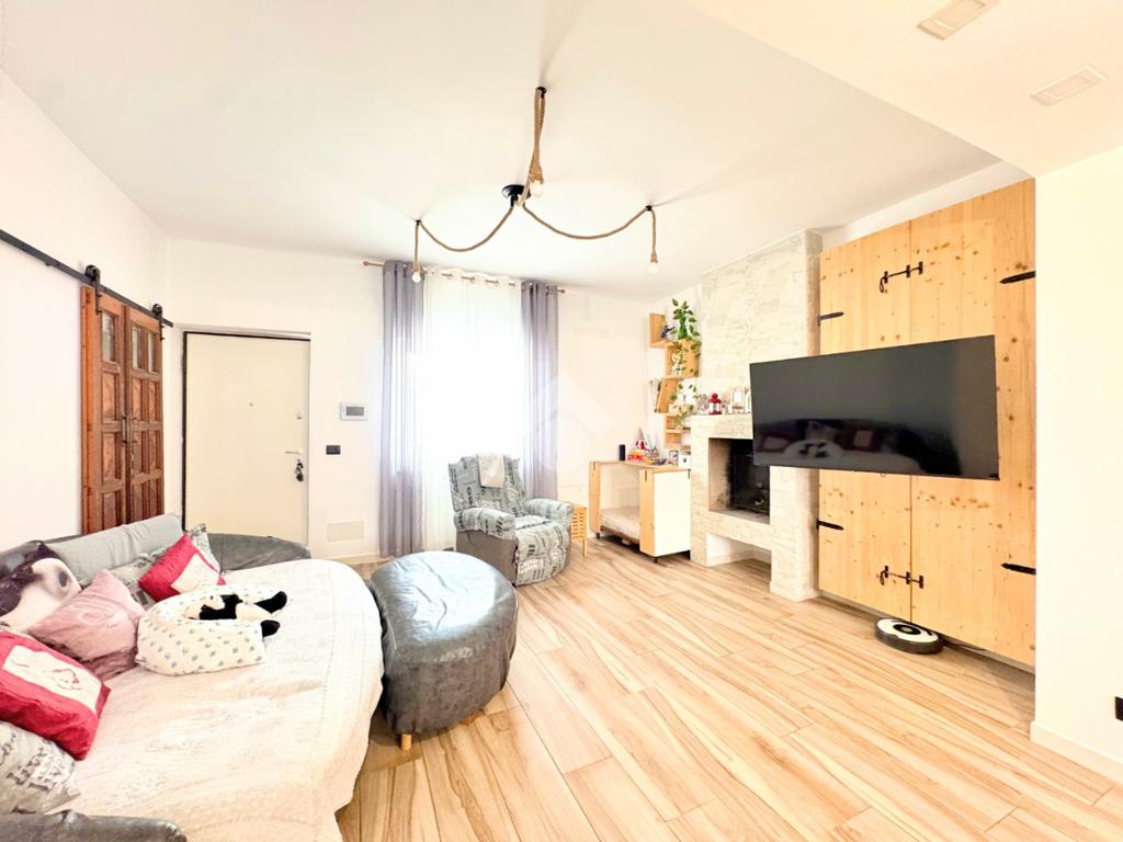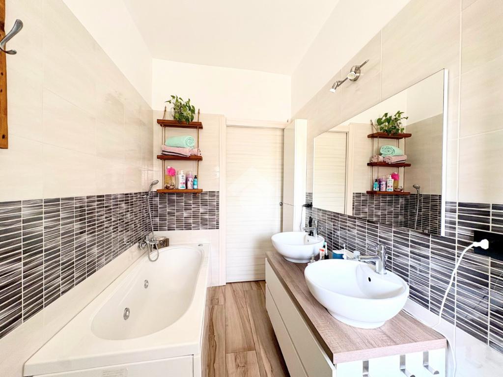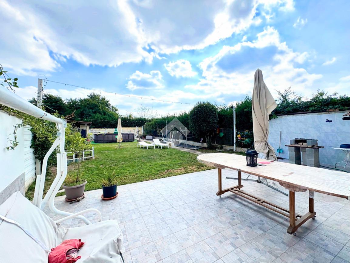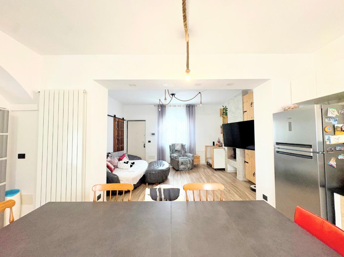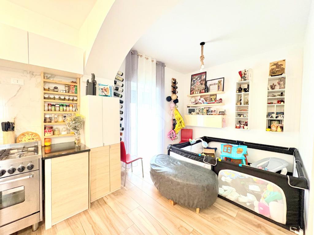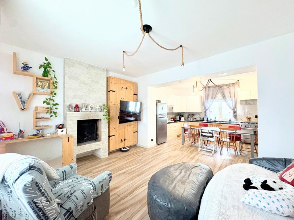 Al piano terra il portoncino blindato si apre sulla grande e luminosa zona giorno con cucina a vista e accesso diretto al giardino privato, ideale per pranzi all'aperto o momenti di relax.