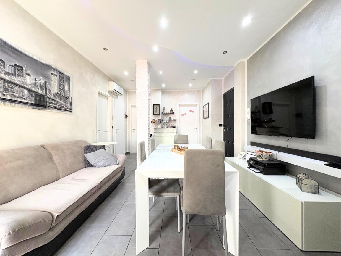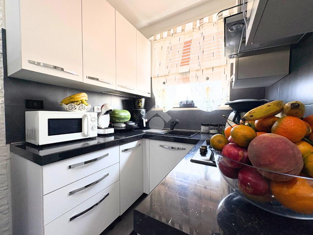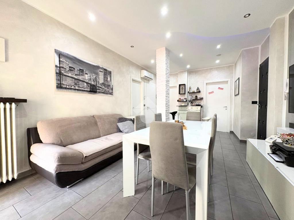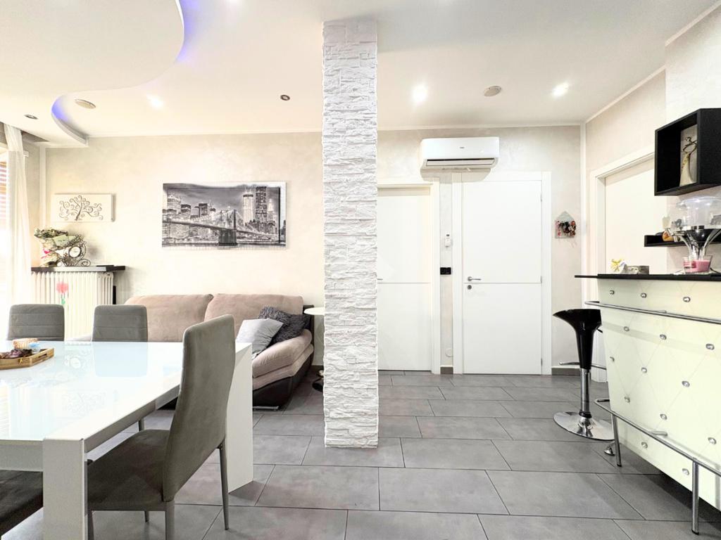 Il portoncino blindato si apre sull'ampio soggiorno con il cucinotto a vista, creando uno spazio accogliente per momenti speciali.