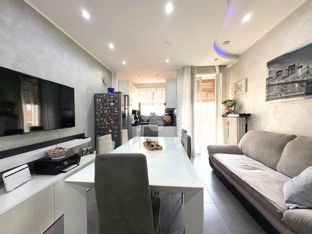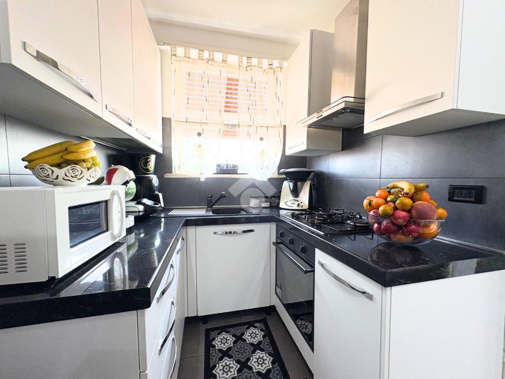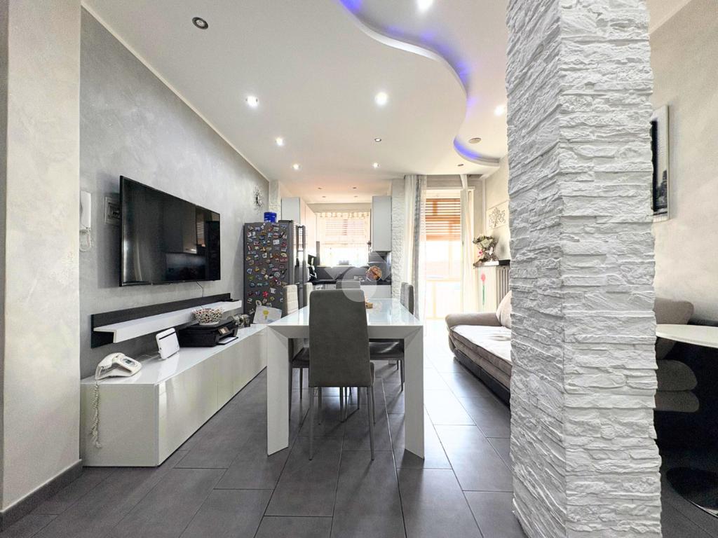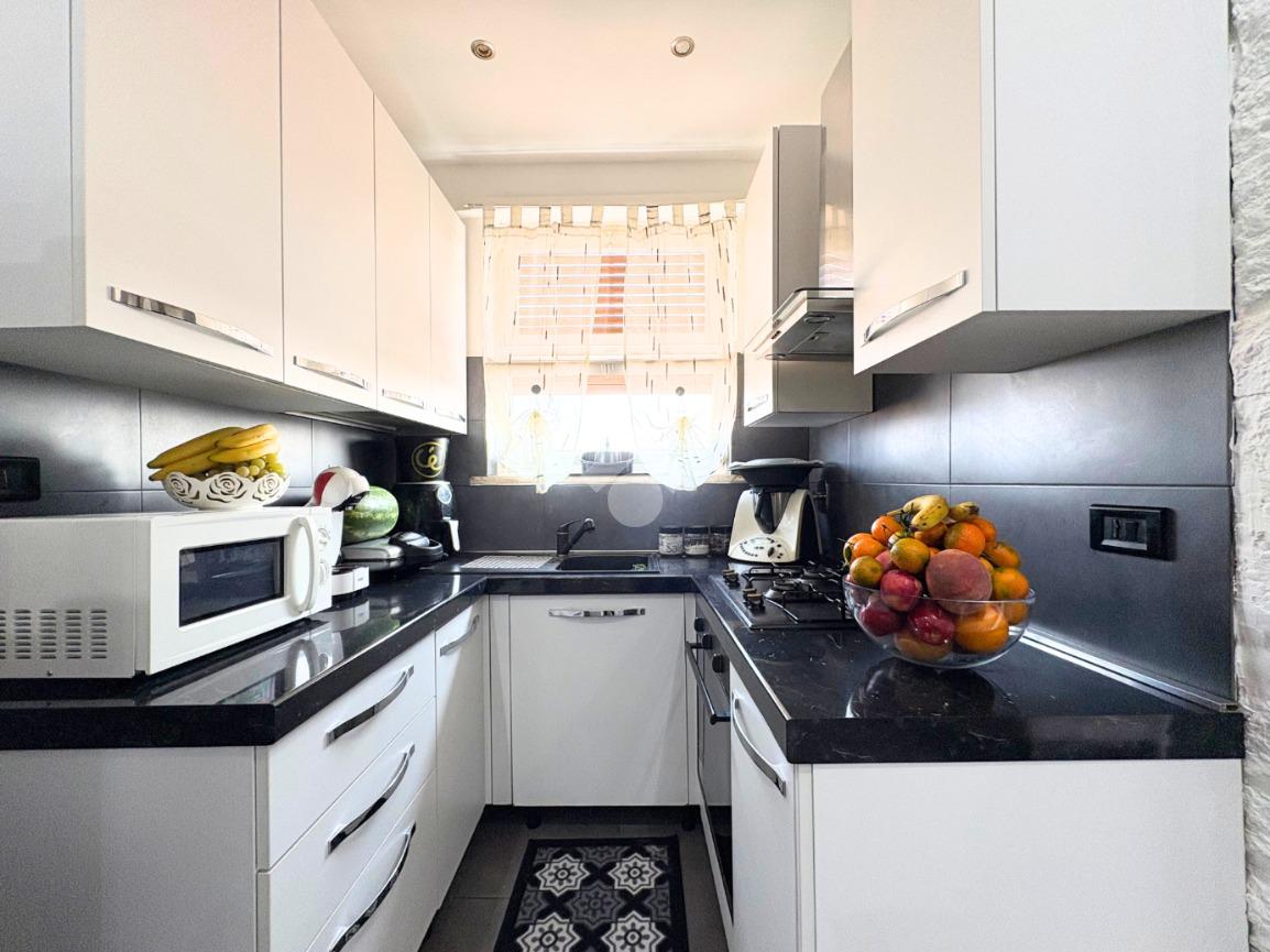 Il portoncino blindato si apre sull'ampio soggiorno con il cucinotto a vista, creando uno spazio accogliente per momenti speciali.